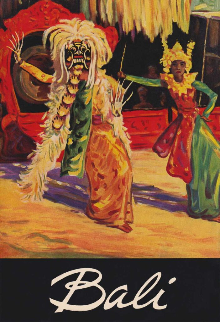 Right: A 1930’s travel guide cover showing two Balinese dancers standing in front of a gamelan ensemble. (Sake Santema Collection)