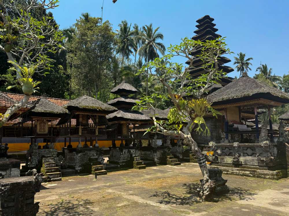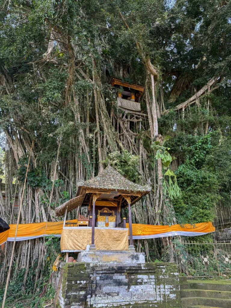 In terms of architecture, the temple possesses the usual tri mandala structure. What differentiates this temple from others is the lack of a candi bentar (split gate) at its entrance. Instead, it features a kori agung (ornate gateway). The temple also has a unique bale kulkul (traditional wooden slit drum), placed on top of a centuries-old banyan tree. In the past, it was said that this kulkul had no staircase, so the jro mangku or temple priest who wished to sound it had to climb the banyan’s roots. It is also believed that if one of the tree’s branches ever falls, it signifies that a grubug, or disaster, is imminent.
