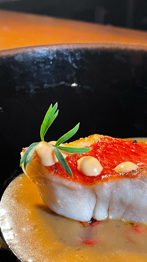 “The Kinmedai is slightly different from the regular red snapper, you can tell the difference from its eyes,” he explains, handling the finishing touches of our next main. Inspired by Jimbaran’s famous seafood barbecue, the Rumari team cooked an aromatic bouillabaisse with Balinese spices – a ‘Jimbaran fish soup’ – the sauce for a perfectly grilled portion of Kinmedai.