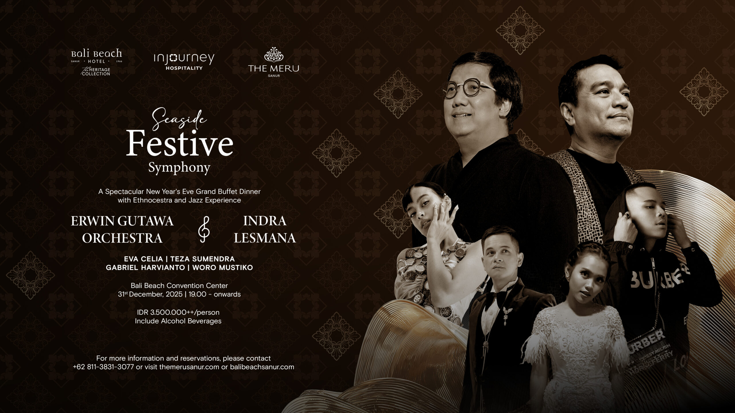 On 31 December 2025, the shores of Sanur will come alive as the Seaside Festive Symphony New Year’s Eve Concert delivers a dazzling finale to the year. The evening will be complemented by a lavish Grand Buffet Dinner, setting the stage for an extraordinary musical experience. Two remarkable forces – the Erwin Gutawa Orchestra and Indra Lesmana – will unite for the night, joined by special guests Eva Celia, Teza Sumendra, Gabriel Harvianto, and Woro Mustiko.