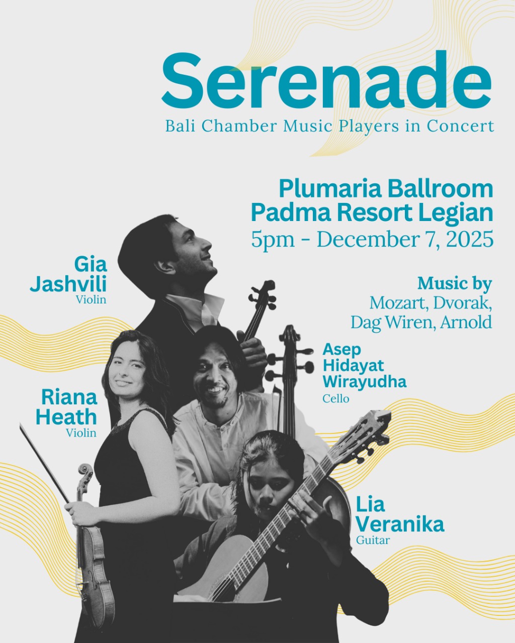 On Sunday, 7 December 2025, enjoy an evening of classical music with a fabulous concert by the Bali Chamber Music Players (BCMP), together with world-class guest performers: Gia Jashvilli, Therese Wirakesuma (BCMP Director), Riana Heath and Asep Hidayat. The concert will take place at the Plumeria Ballroom, Padma Resort Legian, a musical event in support of non-profit organisation, Be Sharp Bali.