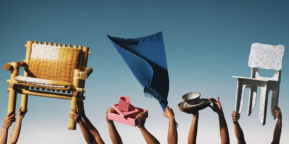 Through methods like plastic casting, glassblowing, ceramic glazing, and natural dyeing with marigold and indigo, everyday waste is reimagined as purposeful design. The result: marbled plastic chairs, refillable candles, bamboo lounge seating, hand-shaped ceramics – pieces that are functional whilst simultaneously reshaping perspectives around waste and material value. Since creation depends on using only materials available through collection, no two pieces in the collection are identical.